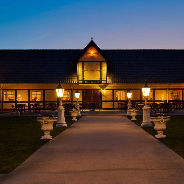 Restauranten på Skrøbelev Gods tilbereder en velsmagende gourmet middag som serveres i de hyggelige omgivelser i Riddersalen.