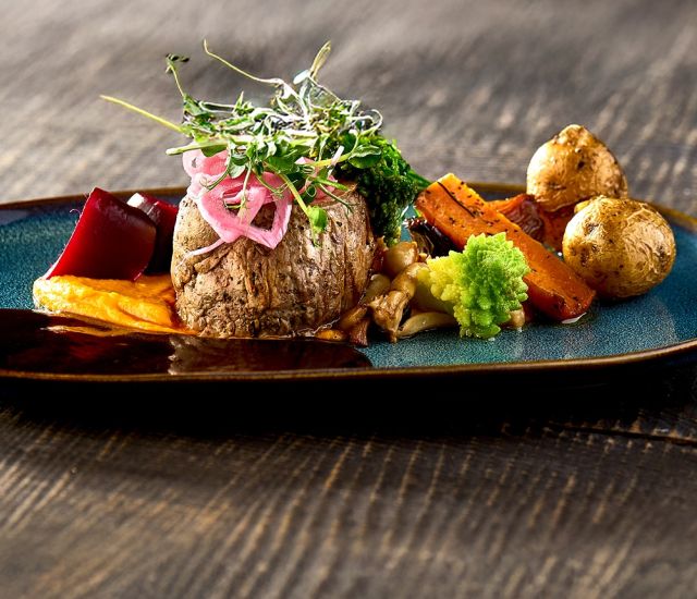 Helstegt oksemørbrad af ungkvæg fra Himmerland320,-Serveret m. sæsonens grønt, smørristede svampe, dagens kartoffel & rødvinsglace.