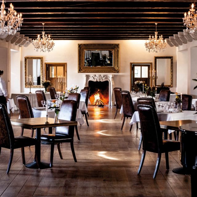 Restauranten på Skrøbelev Gods tilbereder en velsmagende gourmet middag som serveres i de hyggelige omgivelser i Riddersalen.